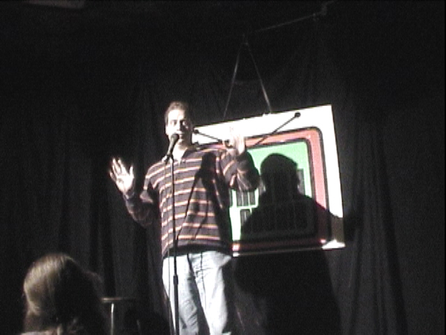 All right, let's talk about the show itself, then. This was a Thursday night gig, so the crowd wasn't quite as large as I've seen it on the weekends, but there were still twenty or thirty people in attendance. And they were tough, but fair -- reviewing the clip, I see that they didn't respond much when I rambled on a bit, but they stuck with me and gave me love for the big punchlines. So that was good -- they weren't a bunch of crickets, but they didn't just feed me pity laughs, either. My kind of people, that.