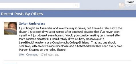 I started with Chevrolet. I've always had a soft spot for them; my very first car was a Cavalier. Which is also how I'd describe its attitude to stopping on wet pavement. So the Chevy Facebook page was a must-visit.