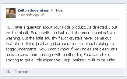 Finally, I swung by to see the Tide people. They've got a new product called 'Pods' that have been giving me fits in the laundry room. Much more of this, and I'm going back to huffing Snuggle.