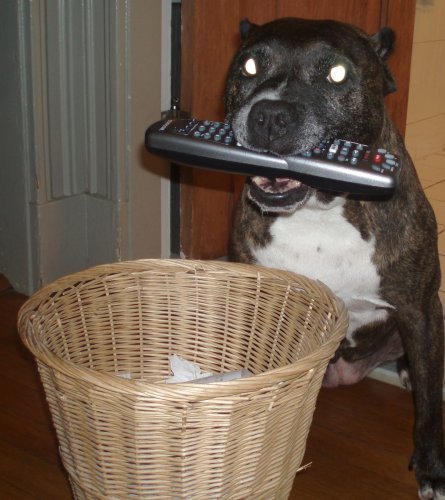 First, I tested the dog, clipping the Annoy-A-Tron to her collar before a walk. Even with the outside distractions, she definitely responded to the intermittent noises -- trying desperately to twist around to find the Terminator that had apparently snuck up DIRECTLY BEHIND HER. So her hearing still works -- as long as it's not me doing the beeping. Just for that, I left the device on her collar for the whole walk -- or at least until the thing squealed down the block, and she backflipped into Mrs. Wilson's petunias trying to get at it. We scurried home pretty quickly after that; the mutt doesn't listen, but she still knows when to "cheese it!"