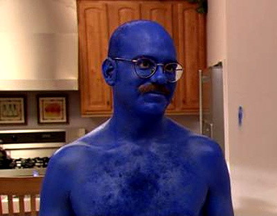 BLUE. Both teams feature the color blue prominently -- so why couldn't I? I Smurfed myself up from head to toe with this paint, and hosted from a fully neutral and impartial hue. Also, from a pair of visitor's-gray underpants. Because even the neutral need a touch of decorum.