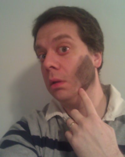 The answer came to me in a flash -- the cell phone. So I applied a liberal coat of the black stuff to the face of my cell phone, and waited for the next call to come in. When it did, I absent-mindedly lifted the phone to my cheek as usual, and thought nothing more about it. Until people started asking me why I was growing one really dark mutton chop, or how I managed to live with a huge rectangular hole in my face.