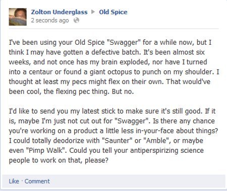 Well, first I put my beef back in my pants. But then, by golly, I wrote a strongly-worded missive to the aftershave conglomerate, complaining about their "one smell fits all" philosophy: