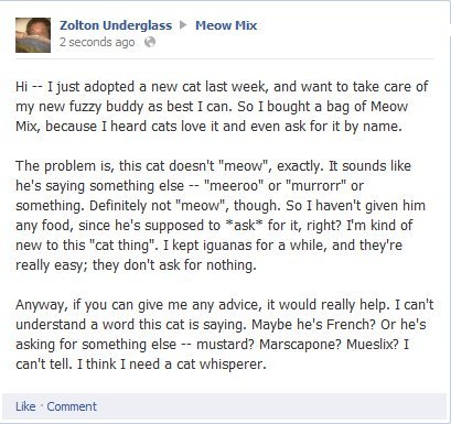 But my cat food is Meow Mix -- and the cat is no conversationalist: