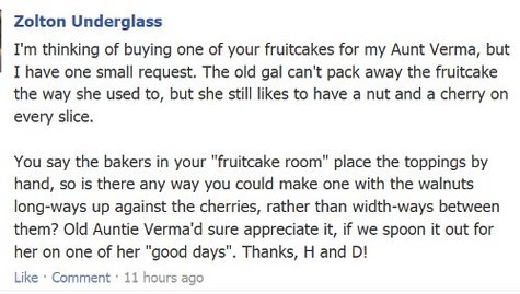 Read on for my mail order queries -- and my actual posts on the companies' Facebook walls. Maybe you'll find a present for Cousin Clete or your Great Aunt Petunia's kid with the lazy eye whose name you can never remember.