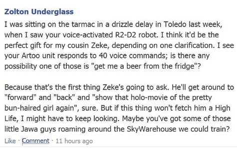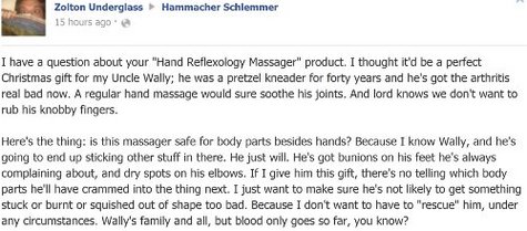 During my annual schlock-shopping spree this week, I found I had some questions about the gaudy sweatshop-produced doodads I was buying for my loved ones. Luckily, the big mail order companies are all on Facebook now. Ho-ho-how convenient.