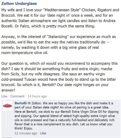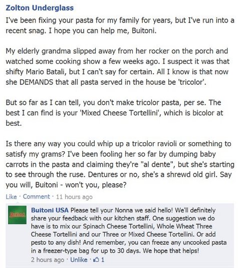 Still, I love-a the pasta. And what better way to ring in springtime than to hit up a bunch of pasta makers for their delicious noodly secrets? Read on for some punky pasta pestering -- and my actual posts on the companies' Facebook walls. That's-a spicy spring-a ball, no?