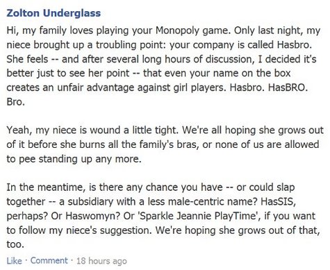 So when I notice a company sneakily appealing to only women or exclusively men, do I sit idly by, waiting for SuperGenderNeutralPerson to fly in and save the day? No. I log into Facebook.