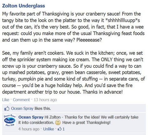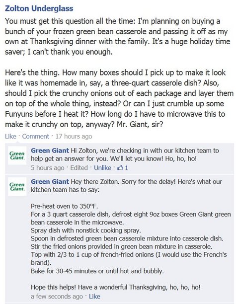 In the true spirit of Thanksgiving, I reached out to a few of the biggest holiday food icons for advice on how to make my Turkey Day nosh a beast of a feast. Read on for the details -- and my actual posts on the companies' Facebook walls -- to spruce up your own gobbler extravaganza.